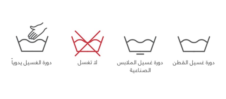 - المنتجات الحساسة التي تحتوي على تطريز أو مواد صعبة الغسيل تتطلب التنظيف الجاف فقط وفقًا للتعليمات الموجودة على بطاقة العناية.